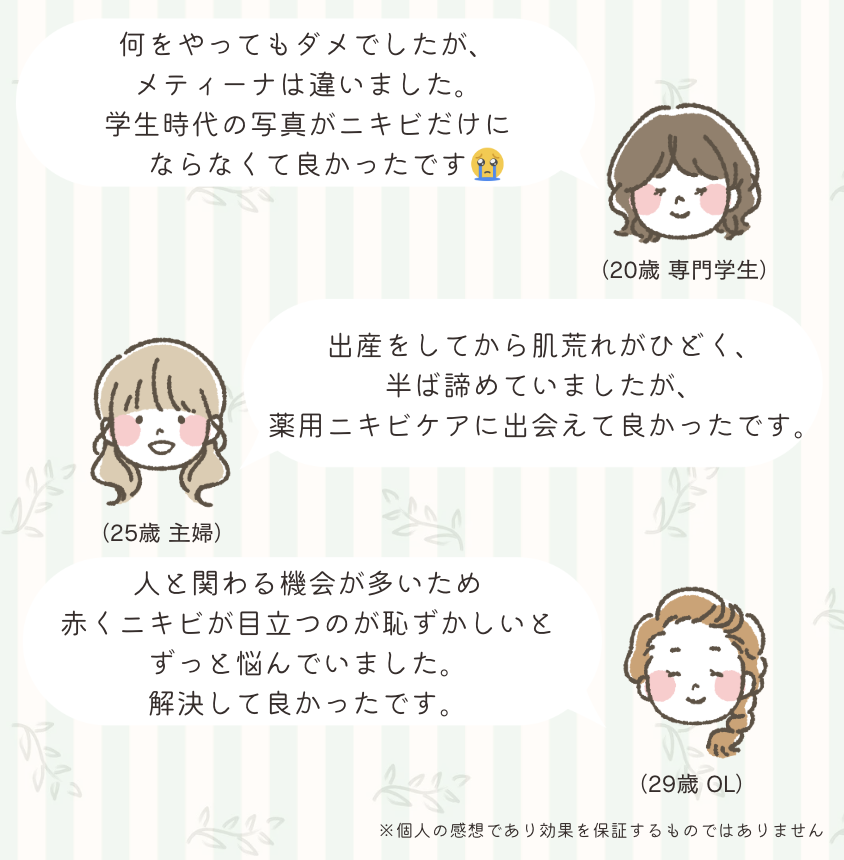 「メティーナ」は、私のように長年ニキビ肌に悩んでいる20代〜30代の女性に支持を得ているみたいです。
