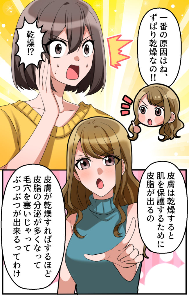乾燥することにより、皮脂が保護しようとして過剰に分泌され、毛穴を塞いじゃうんです!
