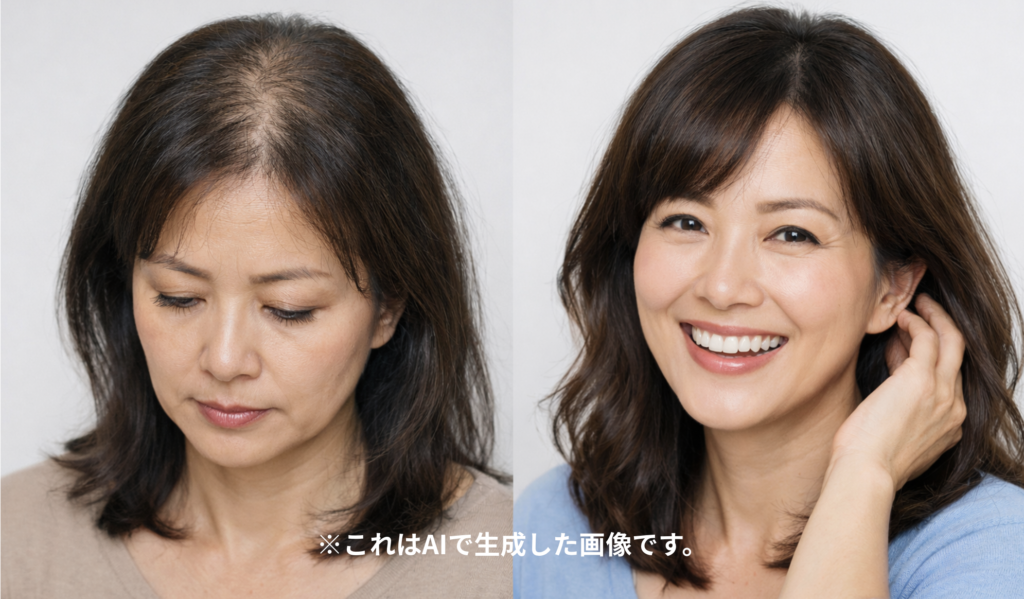 下の画像はAIで生成したものですが、やっぱりボリュームがあるのとないのとでは、見た目年齢が全然違います。